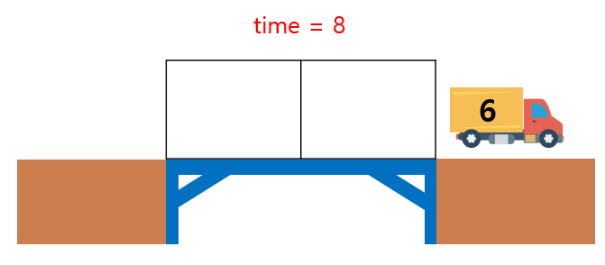 1초~10초 동안 트럭 10개가 다리위로 올라가고, 마지막 트럭이 다리 100칸을 완전히 지나는데 100초가 허비된다. (10 + 100 = 110), 100초 동안은 새로 올라오는 트럭은 없이 이미 다리위에 올라가 있는 트럭들이 이동하기만 한다.