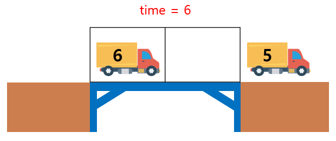 4. 다리 위를 지나는 트럭 상황에 변화가 생길 때마다 time 시간을 1씩 늘려준다. 그러나, for문은 '트럭을 다리위에 올리는 작업'만을 반복하기 때문에 이 반복문에서 누적된 시간은 '마지막 트럭을 다리위에 올리기까지 걸리는 시간'이다. 문제에서는 모든 트럭이 다리 위를 지나기 까지 걸리는 시간이므로 여기에 다리의 전체 길이인 bridge_length 값을 추가해줘서 '마지막 트럭이 다리위를 지나는데 걸리는 시간'을 추가해줘야 한다.