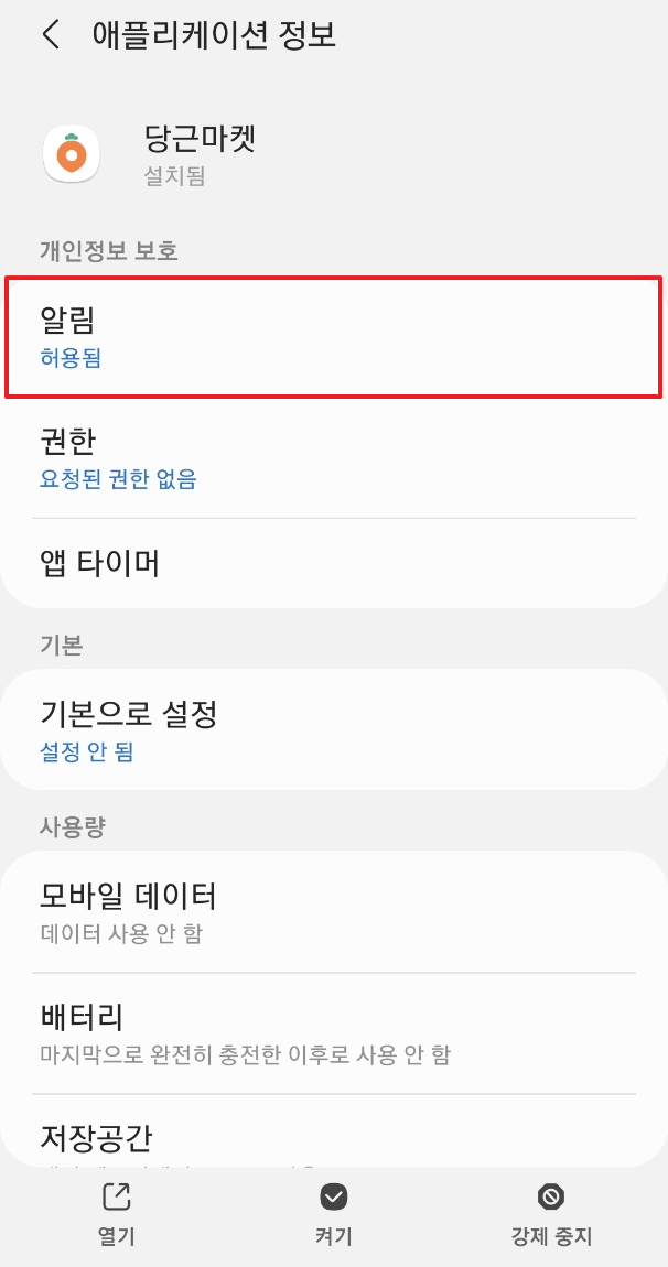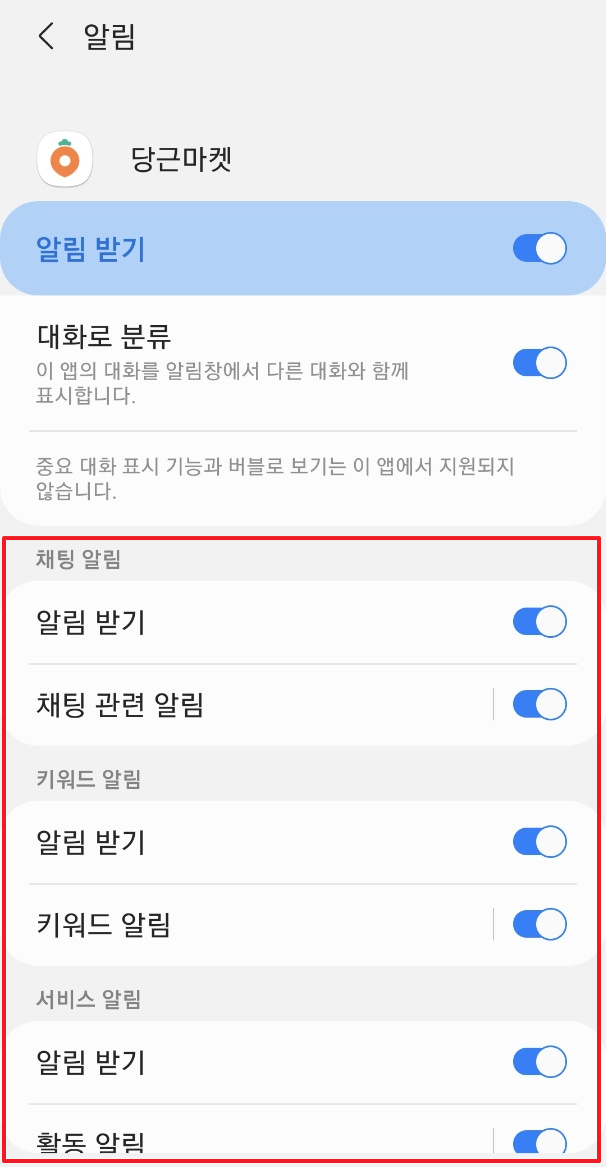 [설정] → [애플리케이션] → [애플리케이션 정보] → [알림] 으로 들어가면 채팅 알림, 키워드 알림, 서비스 알림 등 알림이 세분화되어 있으며 각각의 항목에 대해 개별적으로 알림받기를 설정할 수 있다.