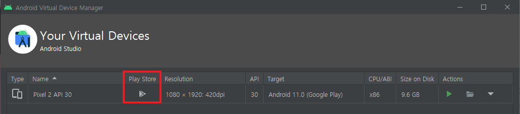 6. 그대로 AVD를 생성하면 'Play Store' 컬럼에 Play Store 로고가 표시된 AVD가 생성될 것이고, 이것을 실행하면 Google PlayStore 앱이 기본으로 설치되어 있는 걸 볼 수 있다.