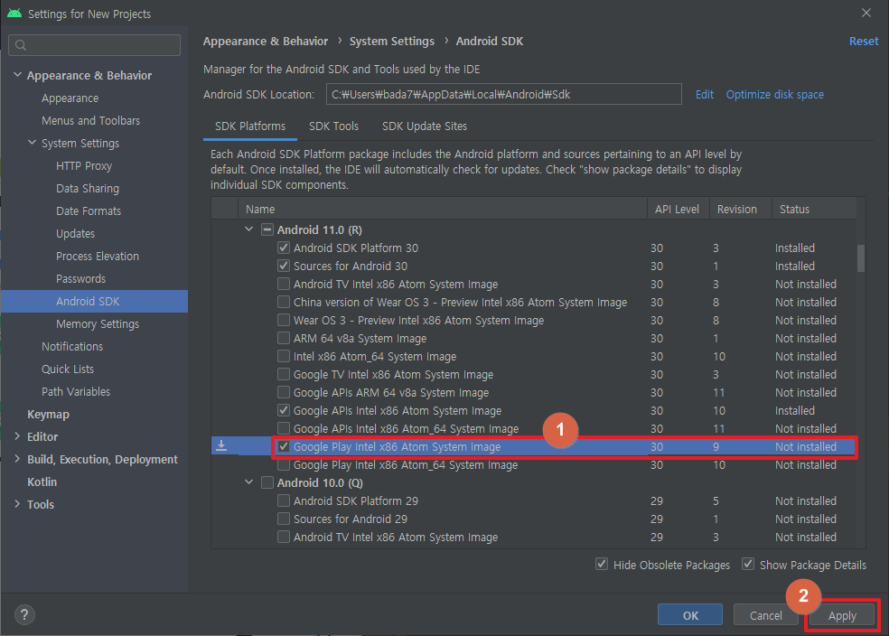 3. SDK 버전 패키지 별 구성요소가 표시된다. 자신이 사용중인 SDK의 'Google Play Intel x86 Atom System Image'에 체크한 뒤 [Apply] 클릭