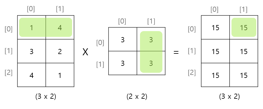 위의 곱셈 공식을 적용한 결과 행렬의 각 칸의 값을 구해보자. 계산과정에서 arr1행렬은 행은 고정된 채로 열만 이동하고, arr2행렬은 열이 고정된 채로 행만 이동하는 것을 볼 수 있다. 또한, 각 칸에 대해 행렬 곱을 수행할 때 왼쪽 행렬은 (하나의 행에서)첫번째 열부터 끝 열까지, 오른쪽 행렬은 (하나의 열에서)첫번째 행부터 끝 행까지 값을 모두 계산에 사용하고 있다. (0~마지막 값)
