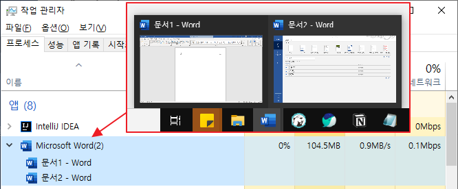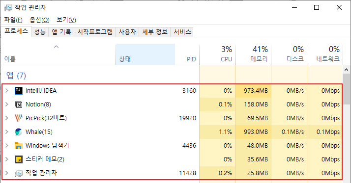 - [Alt + Shift + Esc] 단축키로 [작업관리자] 창에서 프로세스를 확인할 수 있다.