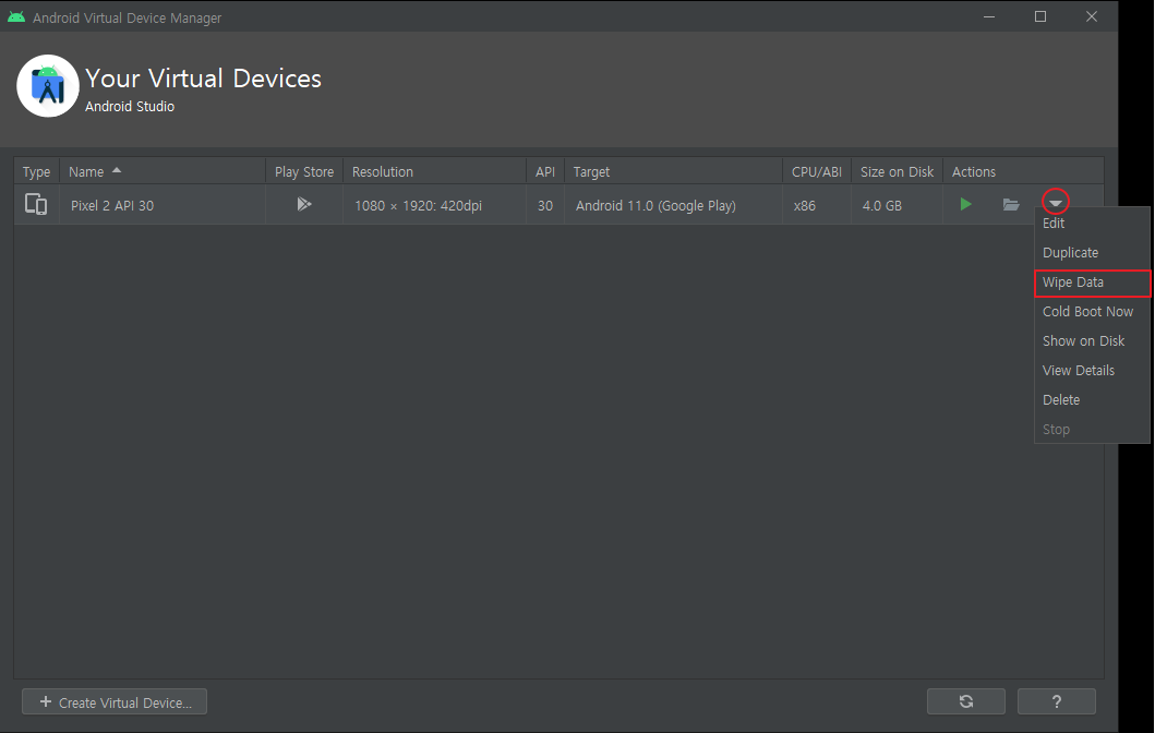 2. 문제가 발생한 가상머신 우측 세모 버튼 > [Wipe Data] 클릭