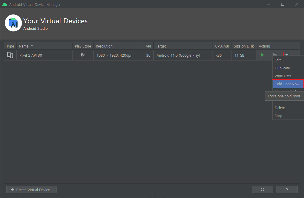 2. [AVD Manager] > 문제가 생긴 AVD의 우측 메뉴에서 [Cold Boot Now] 클릭