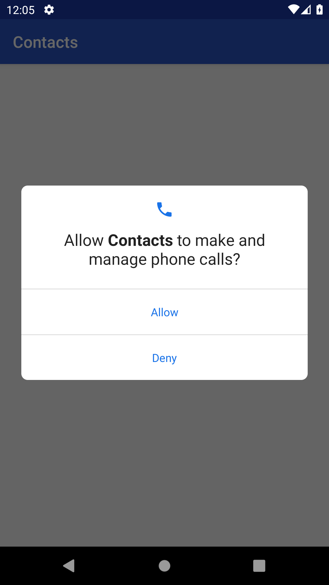 3과정을 진행해 퍼미션 요청 코드를 작성하고 앱을 재실행하면 아래와 같이 "Contacts", "Phone" 에 대한 퍼미션 요청 다이얼로그가 뜰 텐데, 둘 모두 [Allow]를 눌러서 허용해주자.