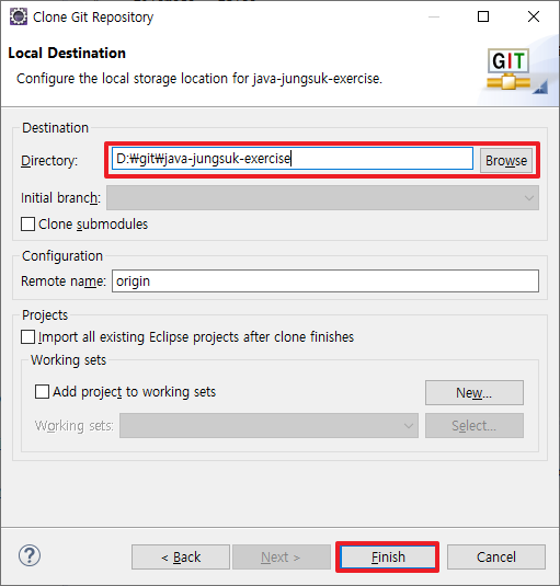 8. 로컬저장소 경로 지정한 뒤 'Finish' 클릭