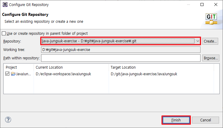 11. 앞의 과정에서 생성한 Repository를 선택, 'Finish' 클릭
