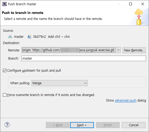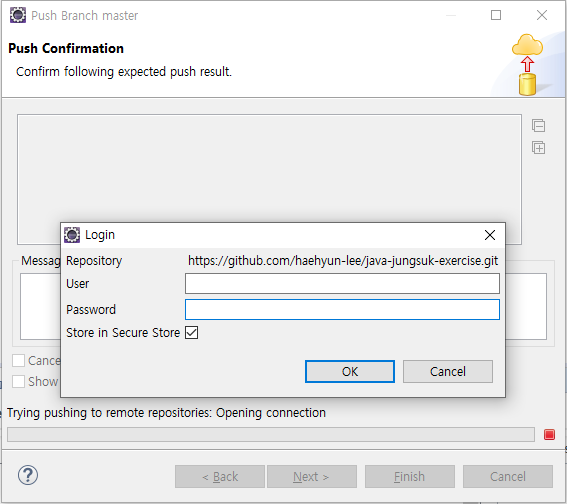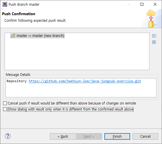 17. 로그인에 성공하면 Push 정보 확인창이 표시된다. 'Finish'클릭