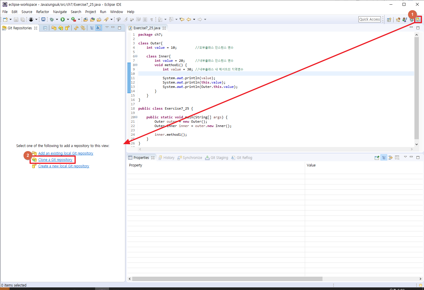 5. 이클립스 우측 상단에 Git아이콘이 생성되며, [Git Repository] 창이 활성화된다. 'Clone a Git repository' 클릭