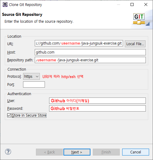 Github에서 생성 Repository에 들어가 URI및 기타 정보를 복사, 이클립스의 'Clone Git Repository'창에 입력