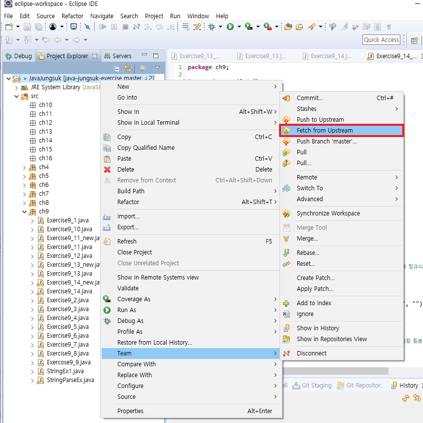 프로젝트 우클릭 > [Team] > [Fetch from Upstream] 을 클릭하면, 원격 저장소의 변경사항이 화면에 표시된다.