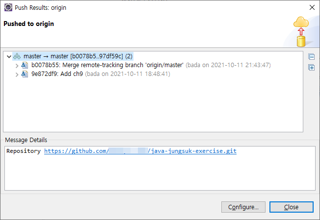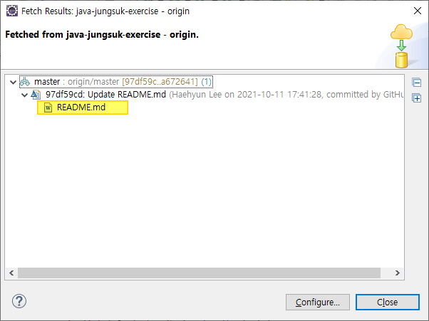 8. 원격저장소의 변경사항을 확인 한 뒤 [Close] 클릭