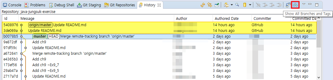 [History] 탭에서 [Show All Branches and Tags] 아이콘을 클릭하면 Fetch로 내려받은 내용도 함께 표시된다.