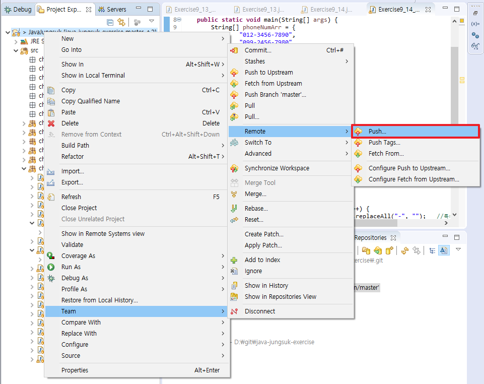 12. Project Explorer에서 프로젝트 우클릭 후 [Team > Remote > Push] 클릭