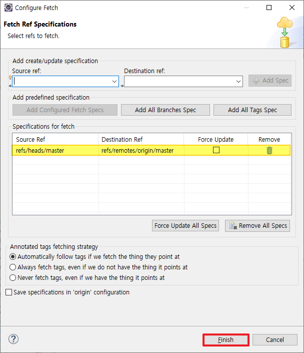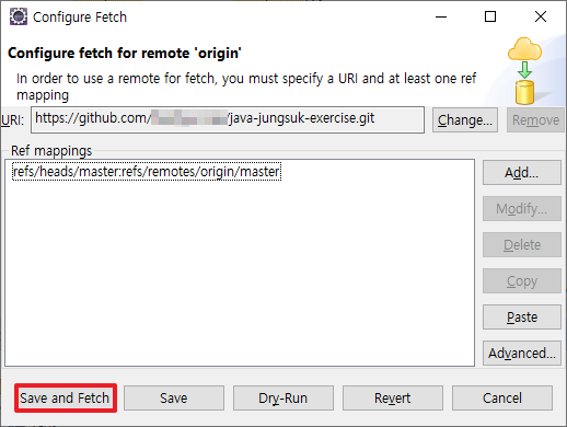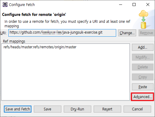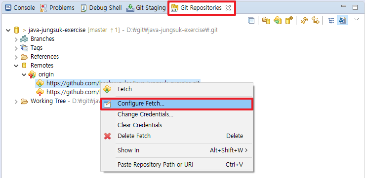 3. 활성화된 [Git Repositories] 탭에서 [Repository명 > Remotes > origin] 선택, [Configures Fetch...] 클릭