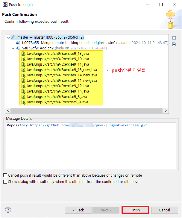 14. 로컬에서 push를 시도했으나 충돌로 인해 reject되어 push되지 못한 파일들이 표시된다. 확인 후 [Finish] 클릭
