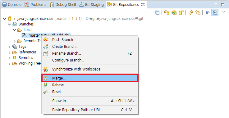 9. Git Repository 탭에서 [Breanch > Local] 에서 Branch를 우클릭한 뒤, [Merge] 클릭