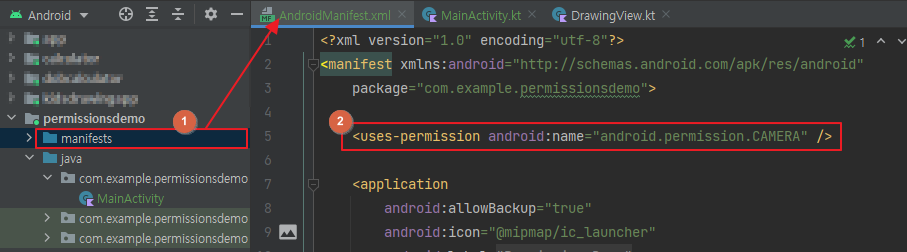 이 앱이 어떤 퍼미션을 요청·사용할지 그 목록을 미리 매니페스트(Manifest)에 설정한다. <uses-permission> 태그의 name 속성에 퍼미션 종류를 기재한다. 요청할 퍼미션 개수대로 <uses-permission> 태그를 추가한다.