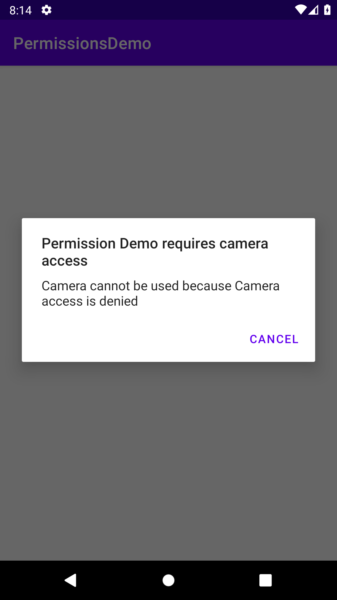 showRationaleDialog("Permission Demo requires camera access", "Camera cannot be used because Camera access is denied")