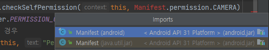 ※ 이때 카메라 퍼미션 문자열 상수를 가지고 있는 Manifest 클래스를 참조하게 되는데, 'android.Manifest'를 Import해야 한다. 같은 이름의 'java.util.jar.Manifest'가 Import 되지 않도록 주의하자.