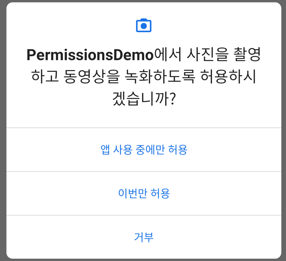 앱을 최초 실행했거나, 이전에 퍼미션을 거부한 경우 퍼미션 허용을 요청하는 메시지창을 표시한다. String 배열을 사용해 한번에 여러 개의 퍼미션을 요청할 수 있다. requestPermissions() 메서드를 이용한 퍼미션 요청 결과(=사용자 응답)는 onRequestPermissionResult() 에서 받아 확인할 수 있다.