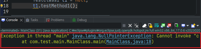 아래 코드는 객체의 아이디를 담지 않고 있는 null 변수에서 객체의 메서드를 호출하고 있기 때문에 본래라면 NullPointerException이라는 런타임 에러가 발생해야 한다.
