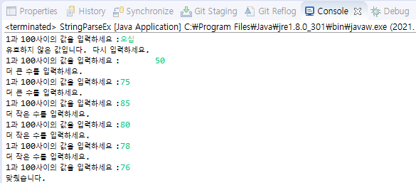 아래는 사용자에게 입력받은 값(String)을 정수로 변환한 뒤 정답 값과 비교하는 숫자맞추기 게임의 소스코드이다.