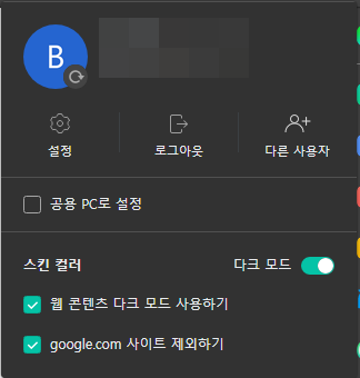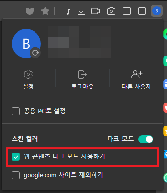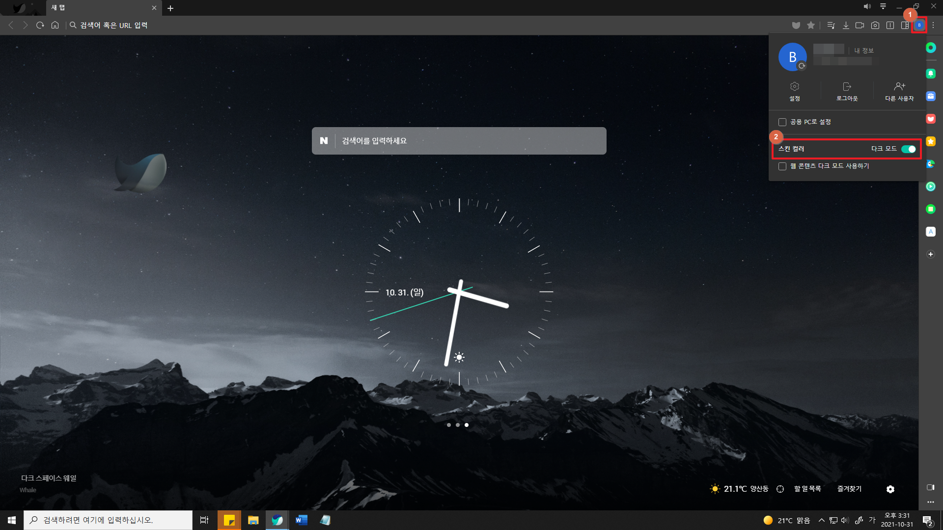 1. 웨일 브라우저 우측 상단의 계정 아이콘 클릭 > 스킨 컬러 : 다크모드 ON