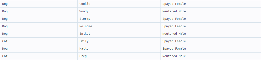 SELECT animal_type, IFNULL(name, 'No name'), sex_upon_intake
