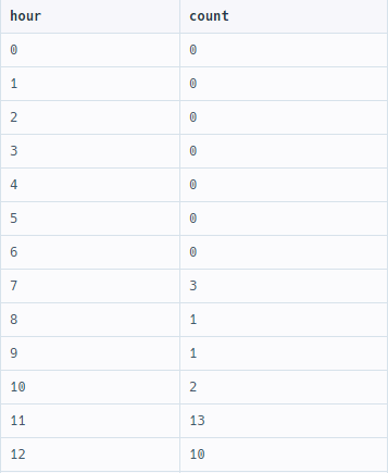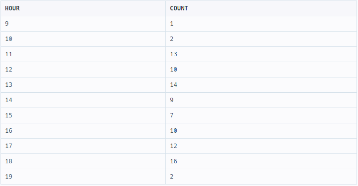 다만 이 방법에서는 TO_CHAR(datetime, 'HH24')의 결과 시간을 0~24의 형태로 표시하기 때문에 문제에서 주어진 기대 결과와 달리, HOUR이 '9'가 아니라 '09'로 표시된다. = 0을 없애는 방법이 있을 거 같긴 하지만 일단 기각..