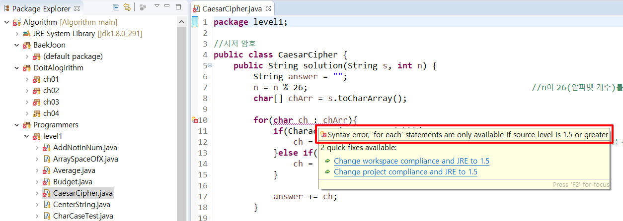 B. Github로 부터 Repository를 성공적으로 내려받았는데, Project Explorer 창에서는 프로젝트 파일들에 빨간색 X표시가 되어있고 제대로 실행이 안될 때가 있다. 이때 엑스표시된 파일들을 클릭해보면 "현재 자바 버전에서는 이 문법을 사용할 수 없으며, 이걸(for each) 쓰려면 소스 레벨을 1.5 이상으로 올려야한다."라는 문구가 표시된다.