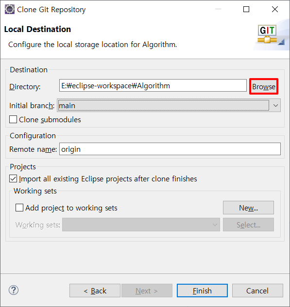 : 원격 저장소 이름 (사용자 지정 / default : origin) - Import all existing Eclipse projects after clone finishes