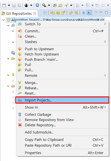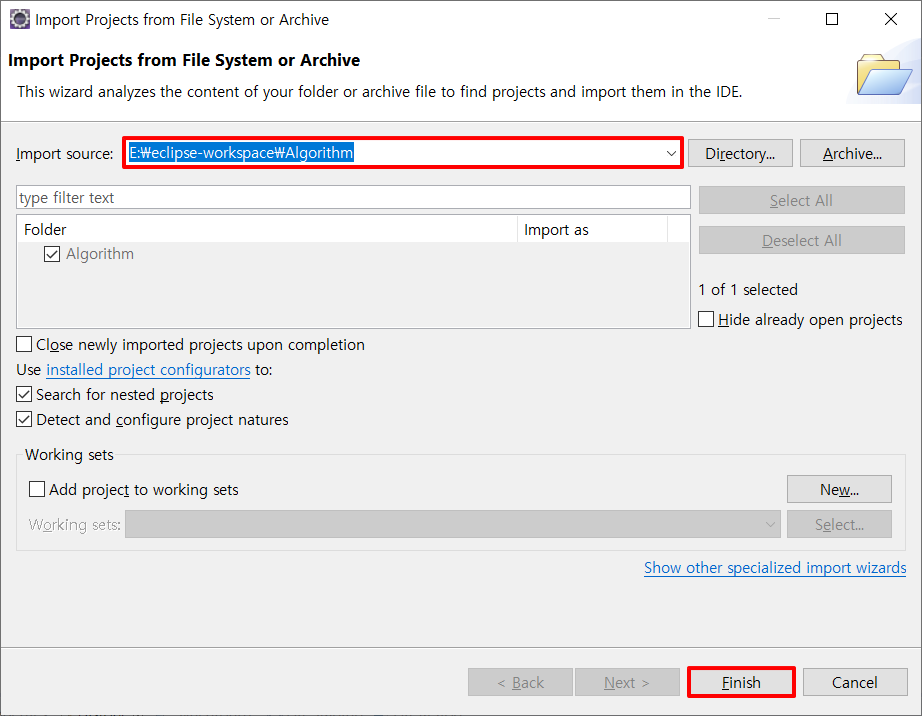 ex) E드라이브의 eclipse-workspace 폴더 안에 Algorithm 폴더를 만들어서 그 안에 모든 프로젝트를 내려받는다.
