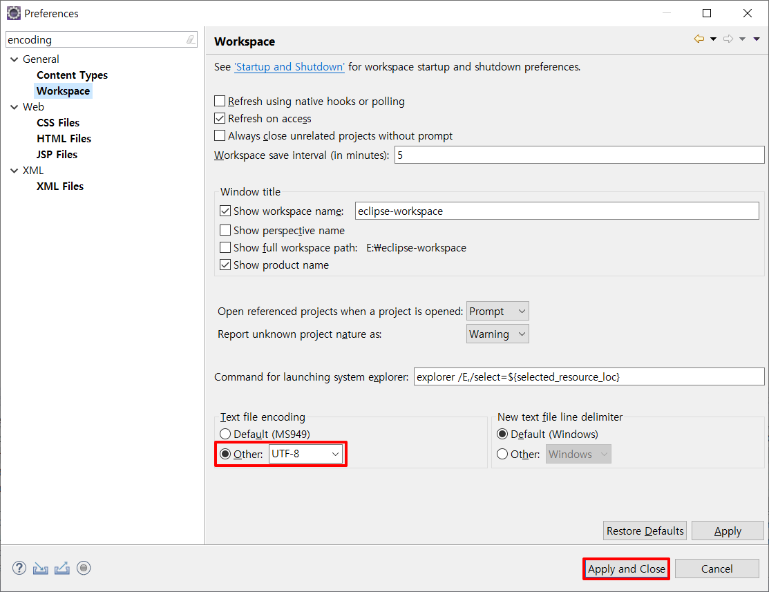 [Windows] > [Preferences] > [General] > [Workspace] 에서 "Text file encoding"을 "Other: UTF-8" 로 변경한다.