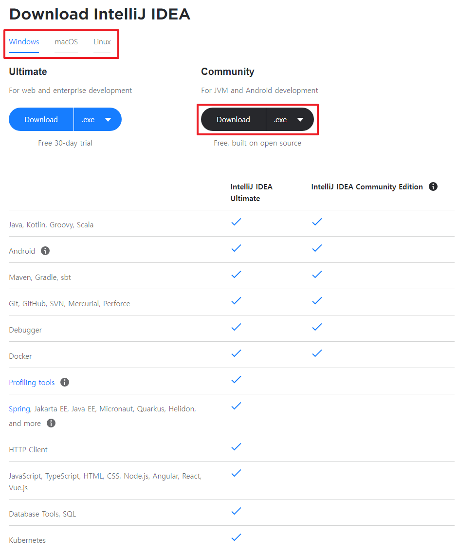 (※ HTML, CSS, Javascript, Spring, React 등 웹 관련 기능을 사용할 수 없다.) - Ultimate Edition - 상용 버전, 모든 기능 제공, 30일 무료 체험 가능
