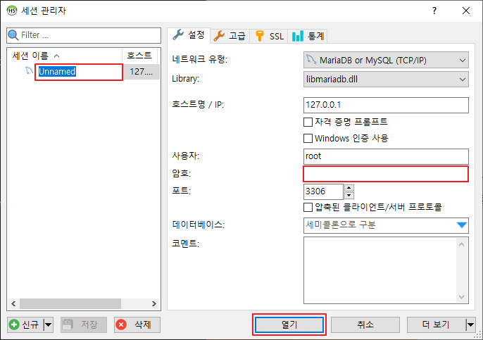 3. 기본으로 입력된 세션 이름을 변경해준 뒤, 암호에 앞에서 설정한 root 계정 패스워드를 입력한 뒤 [열기]를 클릭