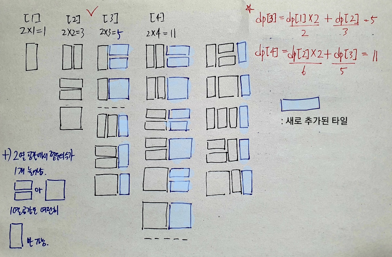 => DP Bottom-Up 방식 - 점화식을 파악하기 위해 2x1 ~ 2x4 까지 예시를 그림으로 그려보면 아래와 같다.