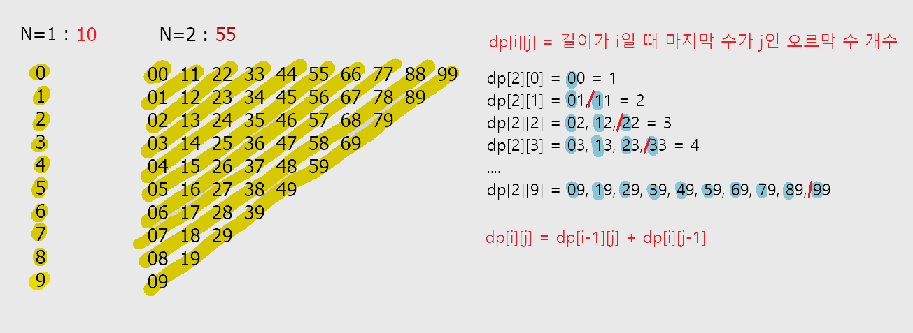 dp[i][j] 는 앞서 구해진 길이가 i일 때 마지막 수가 j-1인 오르막 수 개수 + 이전 차례의 길이가 i-1일 때 마지막 수가 j인 오르막 수 개수의 합이된다.