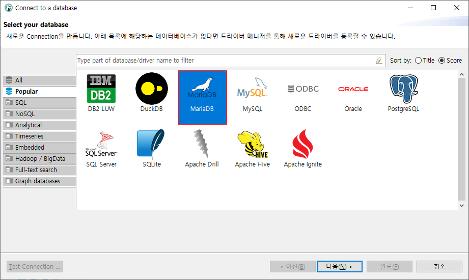2. 연결한 데이터베이스 선택, MariaDB 선택 후 [다음] 클릭