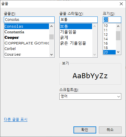 글꼴 변경 후 [확인] 클릭 (크기 변경 10->20)