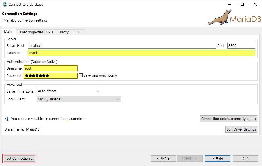 3. DB명, 사용자명, 패스워드 등 데이터베이스 정보 입력 후 [Test Connection] 클릭