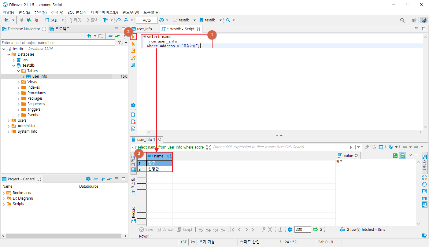 9. 스크립트 창에 SQL문을 작성한 뒤 실행 버튼(Ctrl+Enter)을 클릭하면 하단에 실행 결과가 표시된다.
