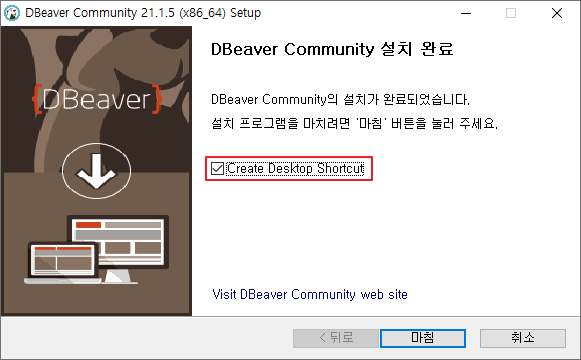 11. 설치가 완료되면 [마침] 클릭 (Create Desktop Shorcut : 바로가기 아이콘 생성)