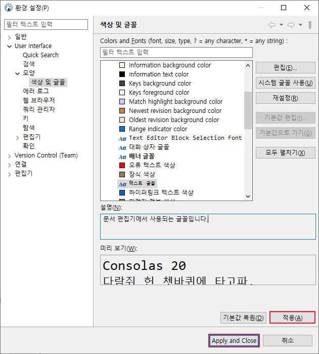 [적용]을 클릭한 후 환경설정 창을 살짝 치워서 메인 창의 폰트를 살짝 확인하거나, [Apply and Close]를 클릭