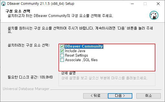 8. "DBeaver Community"와 "Include Java"에 필수로 체크한 뒤 [다음] 클릭