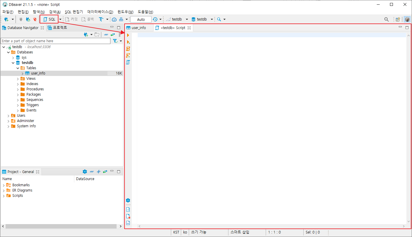 8. [SQL] 버튼을 클릭하면 해당 데이터베이스의 스크립트 창이 표시되며 SQL문을 작성할 수 있다.