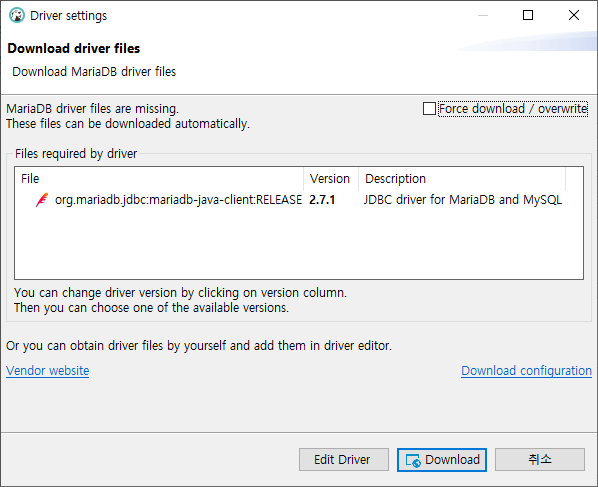 4. Driver Settings 창이 표시되며 MariaDB Driver 파일이 없는데 이를 자동으로 설치하겠냐고 묻는다.