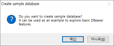3. 샘플 데이터베이스를 생성하겠냐는 안내창이 표시된다. 필요에 따라 선택 (기본 SQLite로 생성됨)