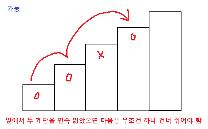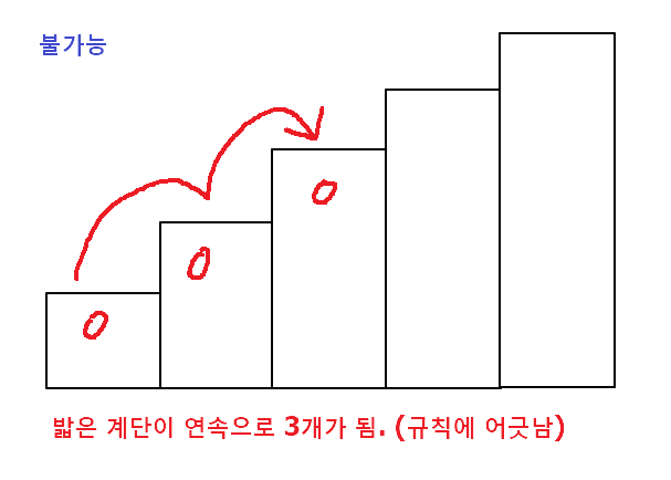 - 연속된 세 개의 계단을 모두 밟아서는 안된다. 단, 시작점은 계단에 포함되지 않는다.